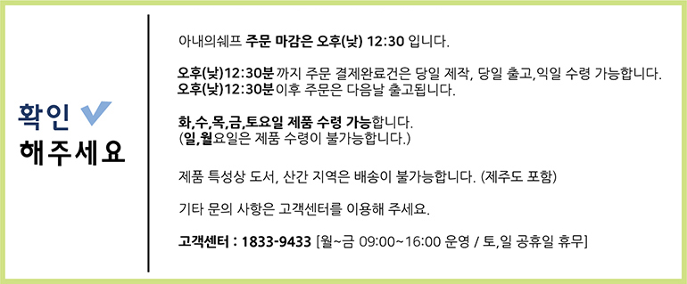 • 세트상품 부분반품/ 신선/ 냉장/ 냉동식품의 경우, 변심으로 인한 반품이 불가합니다.