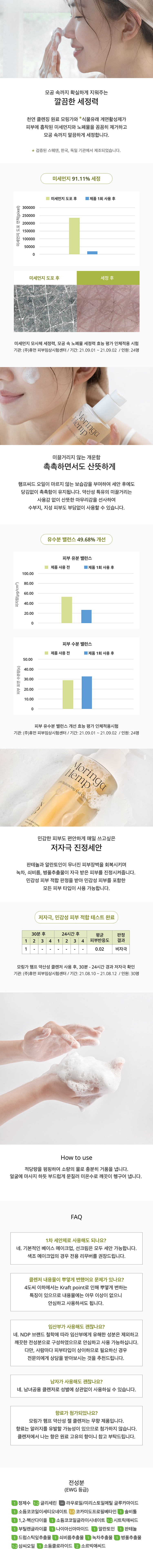 | (7) 화장품품법에 따라 기재·표시하여야 하는 모든 성분 | 정제수, 글리세린, 라우로일/미리스토일메틸 글루카마이드, 소듐코코일이세티오네이트, 코카미도프로필베타인, 솔비톨, 1,2-헥산다이올, 소듐코코일글라이시네이트, 시트릭애씨드, 부틸렌글라이콜, 나이아신아마이드, 알란토인, 판테놀, 드러스틱잎추출물, 쇠비름추출물, 녹차추출물, 병풀추출물, 삼씨오일, 소듐클로라이드, 소르빅애씨드 | ||