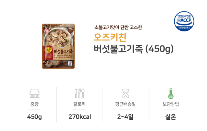 오뚜기 오즈키친 버섯불고기죽 450G 4개