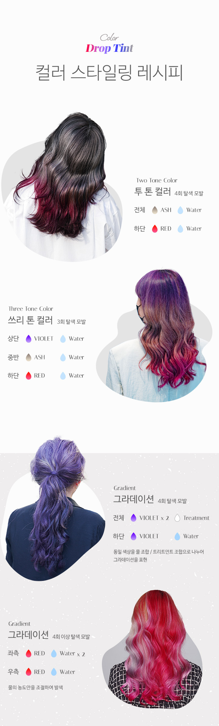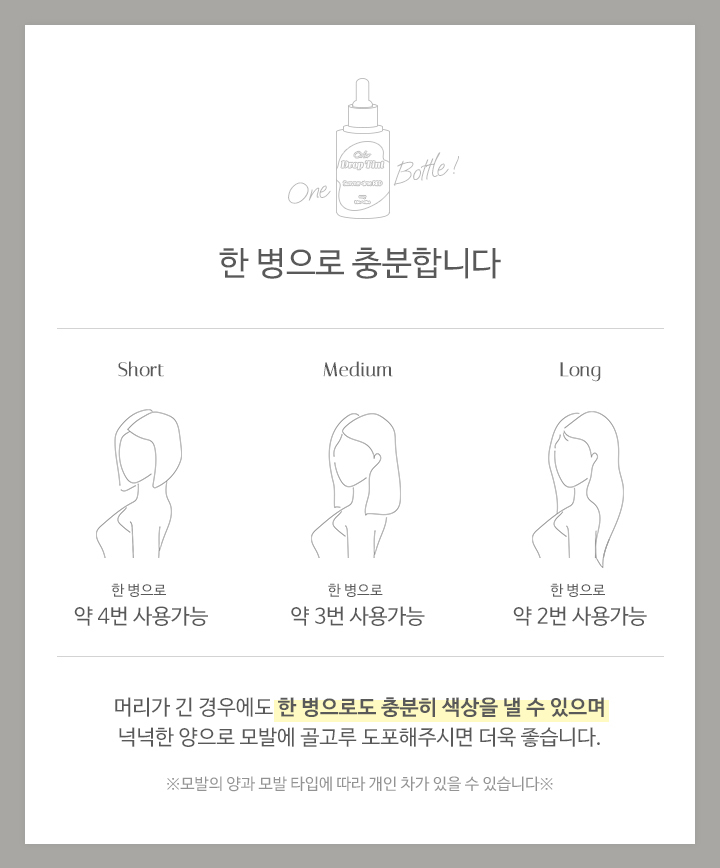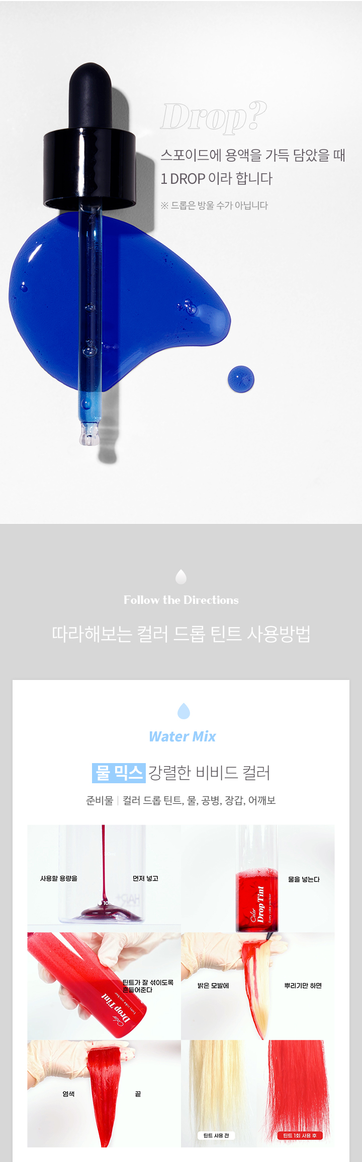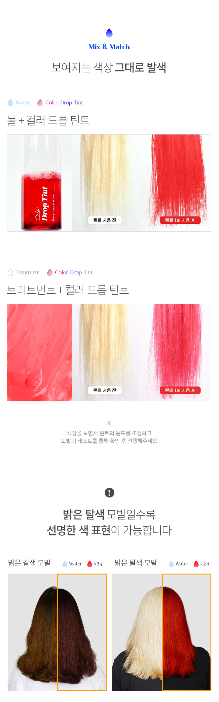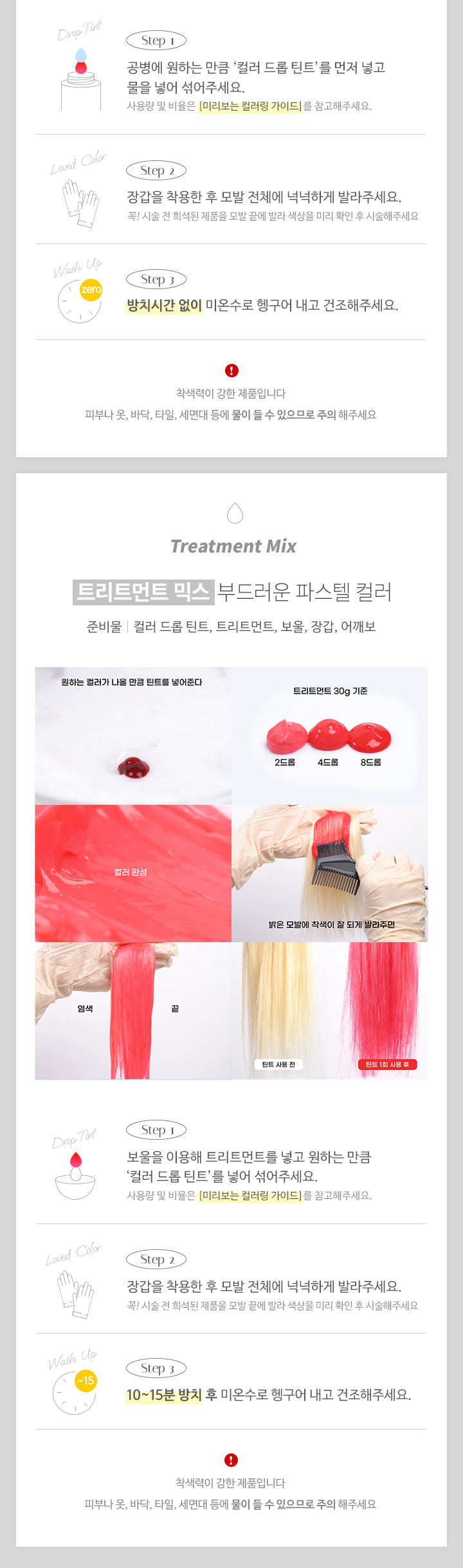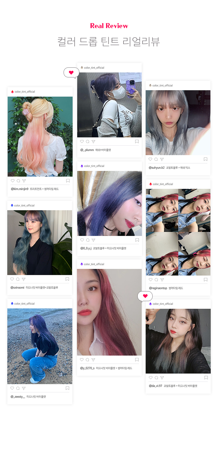 물에 일정 비율로 혼합한 후, 모발에 골고루 도포합니다. 미온수로만 깨끗하게 헹궈줍니다.물 외에도, 트리트먼트나 염색약에 혼합하여 사용할 수 있습니다. 틴트의 농도가 높을수록 색이 진하게 표현됩니다. 갈색모발 및 어두운 모발에서는 컬러체인지가 어려우며, 모발 상태에 따라 효과에 차이가 있을 수 있습니다.