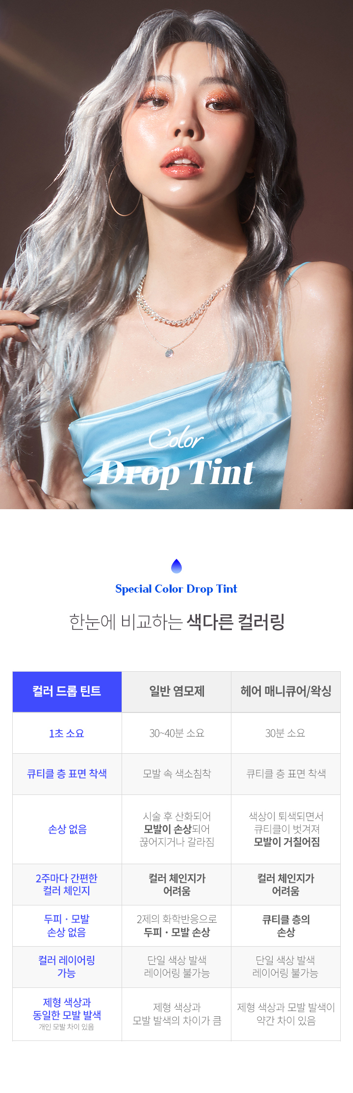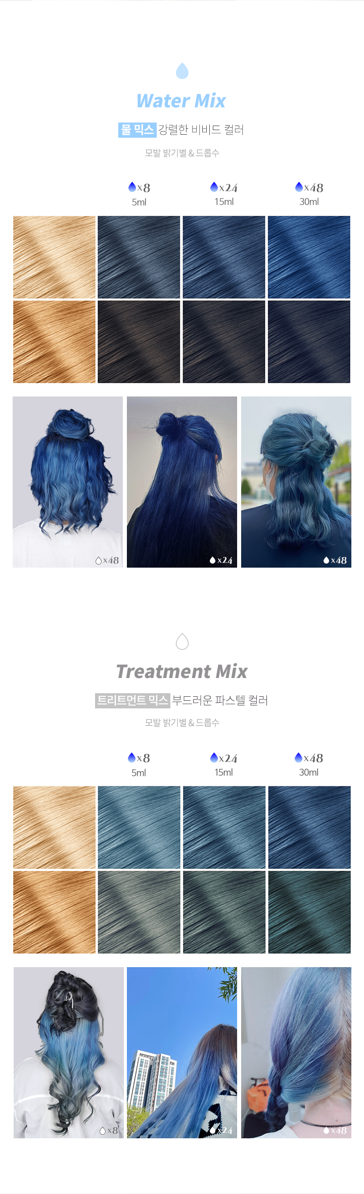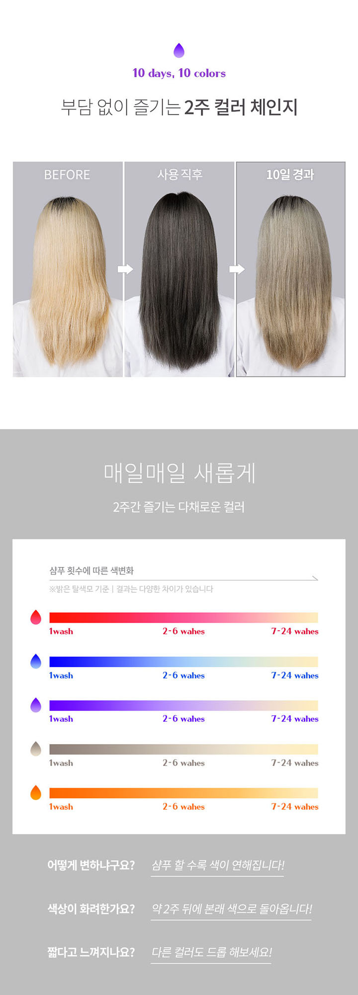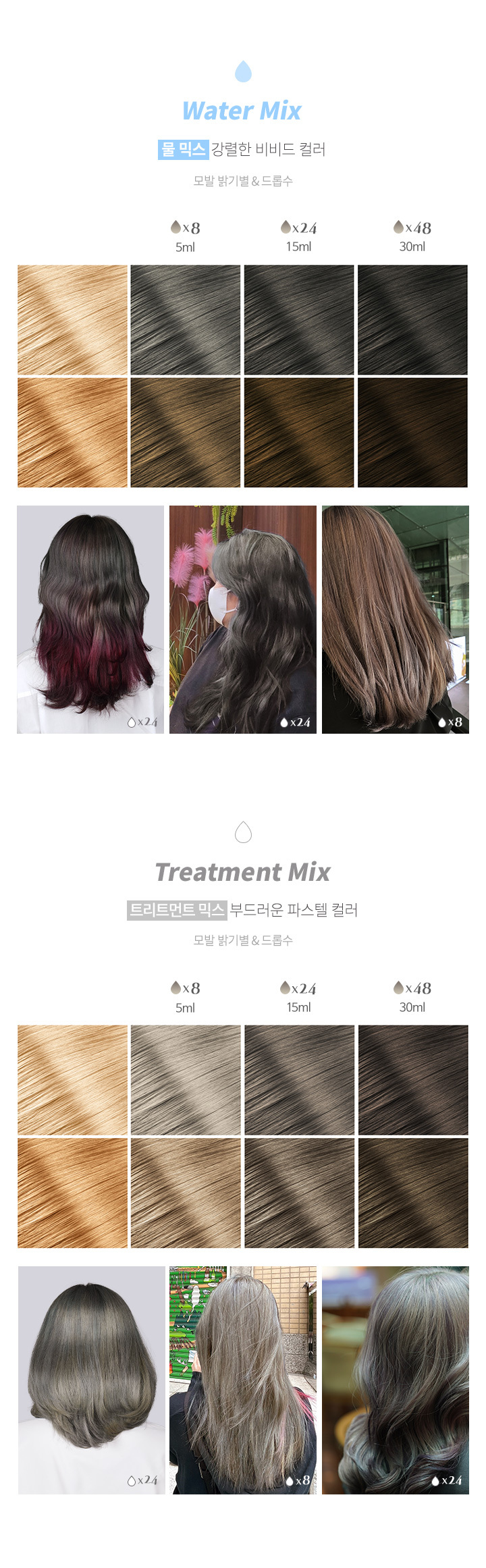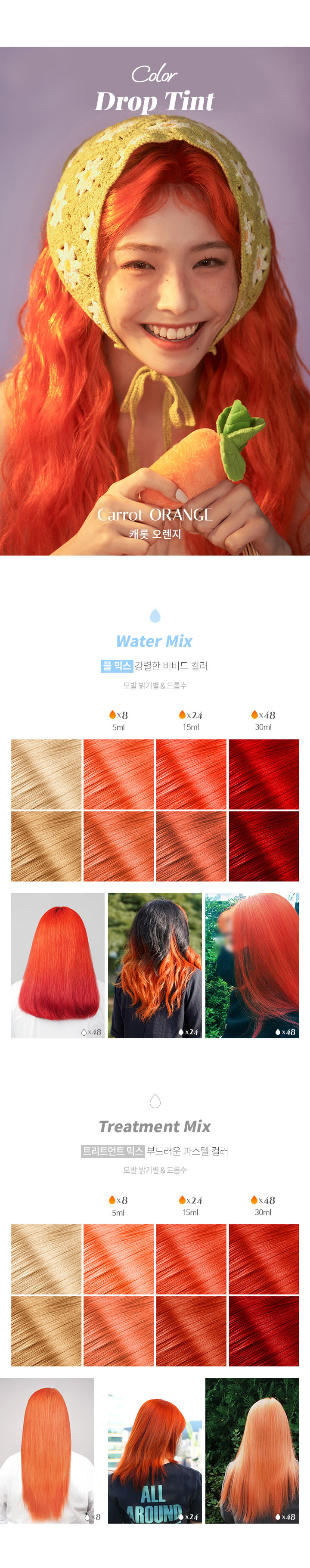 물에 일정 비율로 혼합한 후, 모발에 골고루 도포합니다. 미온수로만 깨끗하게 헹궈줍니다.물 외에도, 트리트먼트나 염색약에 혼합하여 사용할 수 있습니다. 틴트의 농도가 높을수록 색이 진하게 표현됩니다. 갈색모발 및 어두운 모발에서는 컬러체인지가 어려우며, 모발 상태에 따라 효과에 차이가 있을 수 있습니다.