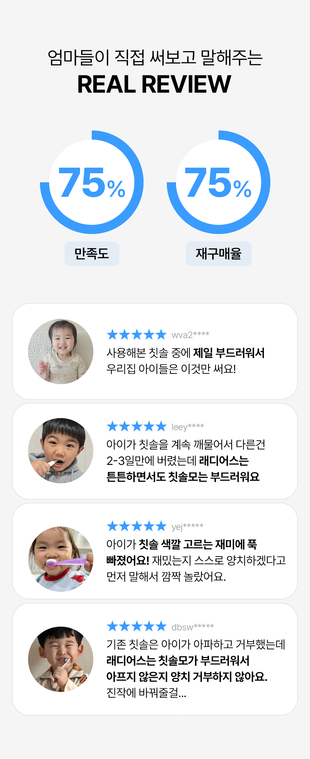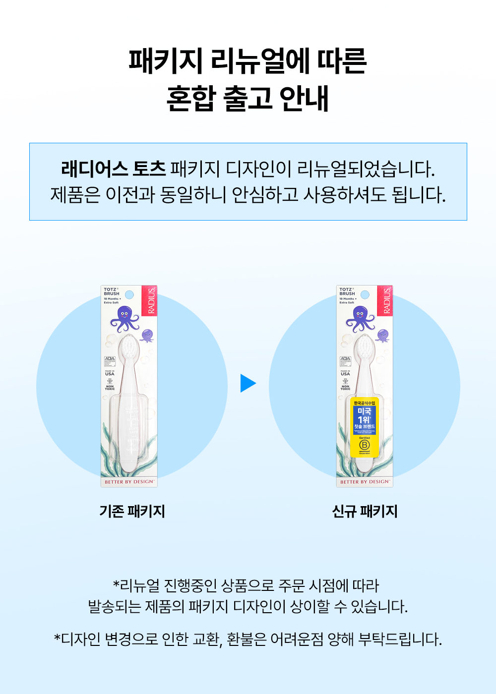1. 위생 상 사용 전 흐르는 물에 헹군 후 사용해 주세요. 2. 아이가 칫솔모를 물어뜯거나 씹지 않도록 보호자의 주의가 필요합니다. 3. 절대 아이 혼자 사용하게 하지 마시고 보호자의 주의/지도하에 사용해 주세요. 4. 직사광선·습기·고온을 피하고 서늘한 곳에 보관해주세요.