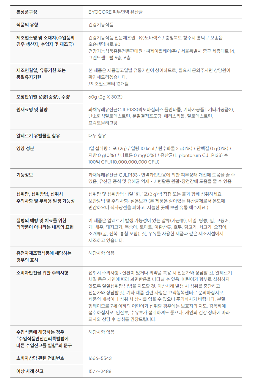 건강기능식품 전문제조원 : ㈜노바렉스 / 충청북도 청주시 흥덕구 오송읍 오송생명14로 80 건강기능식품유통전문판매원 : 씨제이웰케어㈜ / 서울특별시 중구 세종대로 14, 그랜드센트럴 5층, 6층
