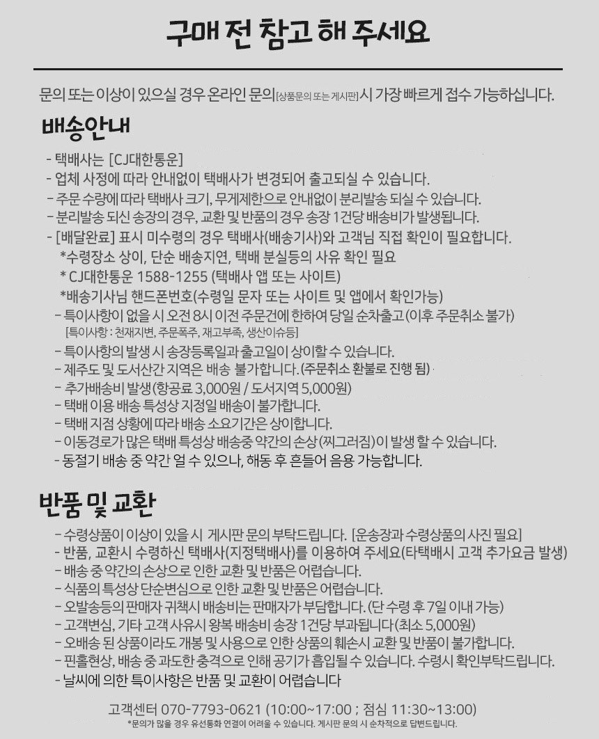 • 저단가 상품, 일부 특가 상품은 고객 변심에 의한 교환, 반품은 고객께서 배송비를 부담하셔야 합니다(제품의 하자,배송오류는 제외)