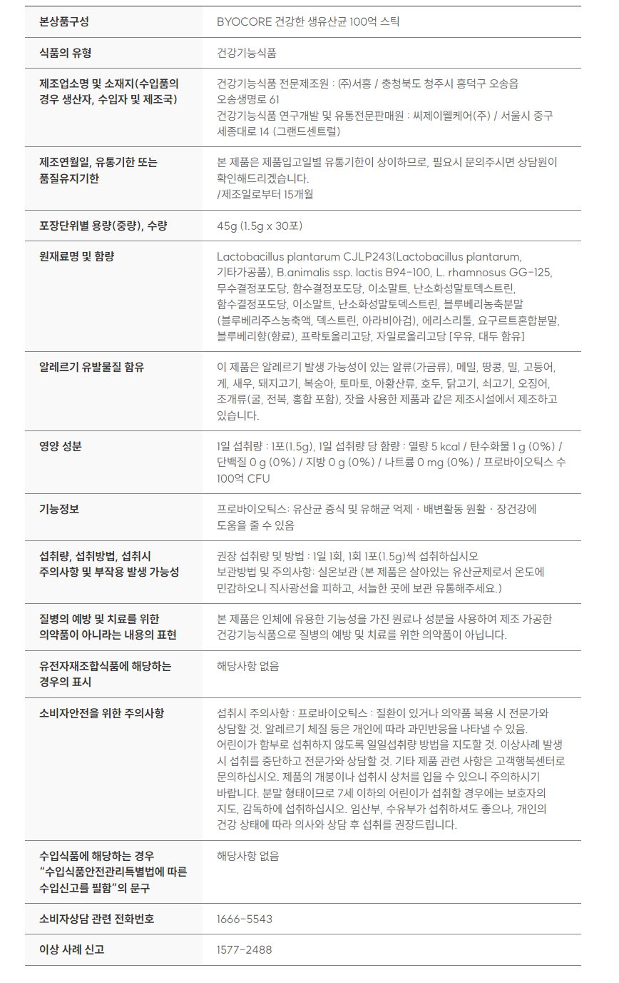 Lactobacillus plantarum CJLP243(Lactobacillus plantarum, 기타가공품), B.animalis ssp. lactis B94-100, L. rhamnosus GG-125, 무수결정포도당, 함수결정포도당, 이소말트, 난소화성말토덱스트린, 함수결정포도당, 이소말트, 난소화성말토덱스트린, 블루베리농축분말(블루베리주스농축액, 덱스트린, 아라비아검), 에리스리톨, 요구르트혼합분말, 블루베리향(향료), 프락토올리고당, 자일로올리고당 [우유, 대두 함유]