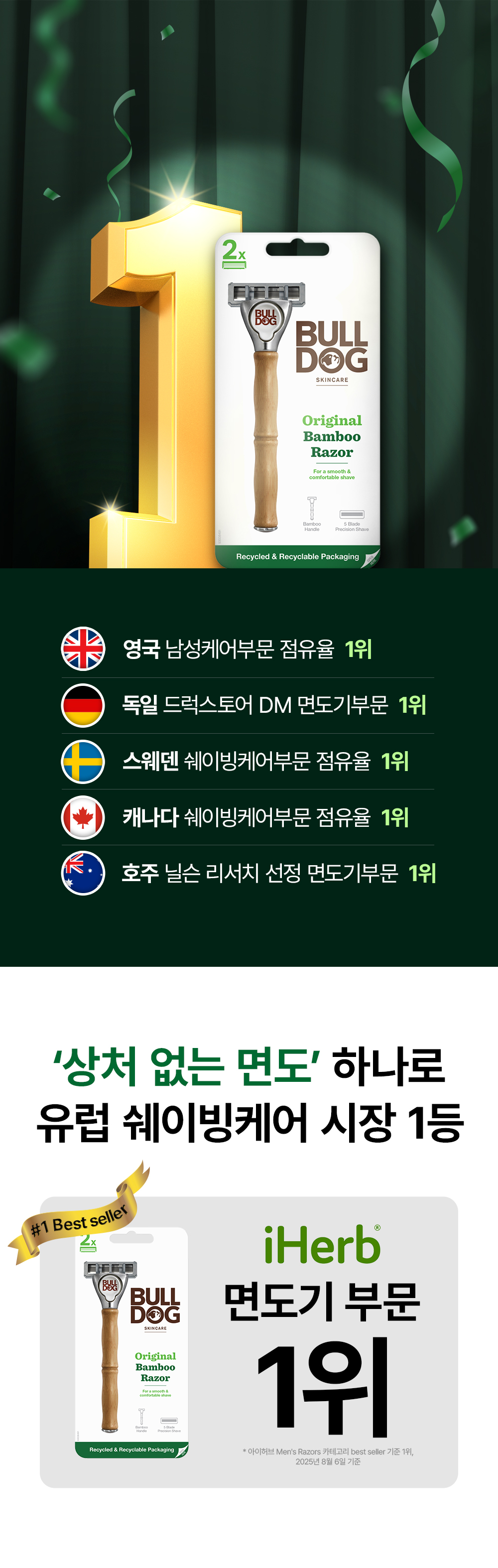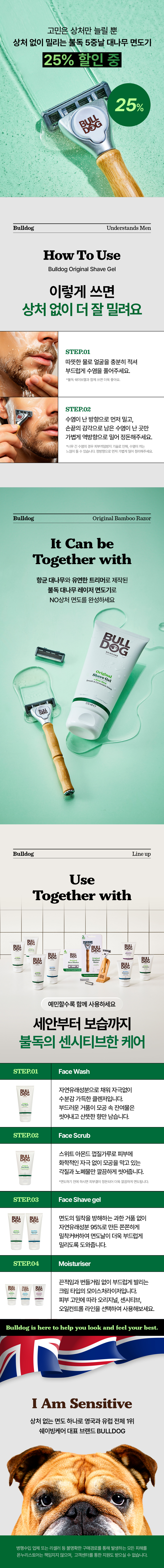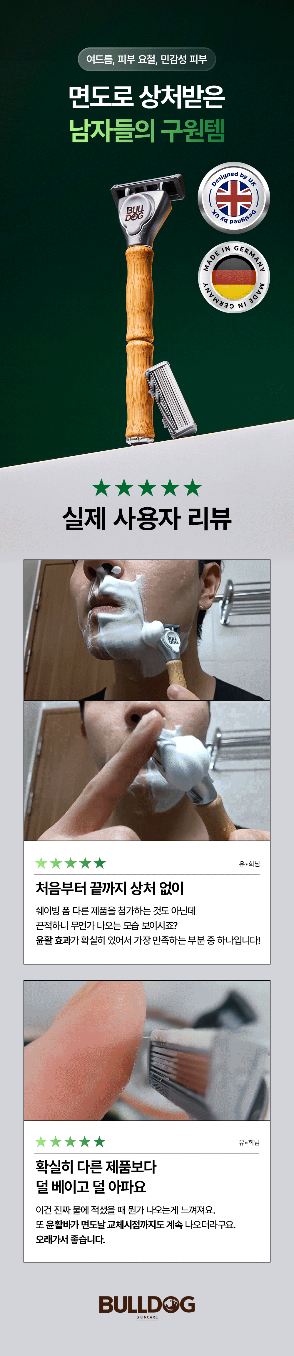 ➡️구매품명: 불독 5중날 저자극 클래식 면도기 부드러운 절삭력 안전한 민감성피부 트러블 브러시드 메탈 헤드 & 유연한 트리머가 만들어내어 세단을 탄 듯한 부드럽고 무게감 있는 움직임과 회전성으로 피부자극 최소화해서 제피부에 잘 맞아요!! 여러 다양한 제품들을 썻었는데 한 제품은 너무 수명이 짧아 두어번 면도하면 날을 교체해야헸고, 하나는 면도날은 괜찮았는데 대가 얼마 사용하지 않았는데 망가져 새로운 제품을 비교해보아야겠다는 생각이 들어 구매해보게 되었습니다. 넓은 면적 5중 강철 헤드가 섬세하고 완벽한 절삭력을 살려주고 알로에 윤활스트립이 있으며 날이 손상될 때까지 사용가능합니다.!! 디자인도 부식 걱정이 없는 대나무로 대를 만들었으며 클래식합니다. ➡️제품총평: 제품 메이커에 대해 처음 접했었지만 사용해보니 생각보다 만족스러웠습니다. 우선 면도날은 타 제품들에 비해 떨어지거나 하지 않았고 워낙 상향평준화 되어있는 시장이다보니 비슷하게 잘 절삭되었습니다. 면도대는 대나무로 만든 제품이 너무 그립감이 좋았습니다. 너무 고급느낌이어서 면도기에 이런 퀄리티가 있구나 하는 생각을 할 정도였습니다. 날도 마음에 들어 조금 더 사용해보고 한달리뷰를 남기겠지만 현재까지에는 너무 만족스럽습니다.