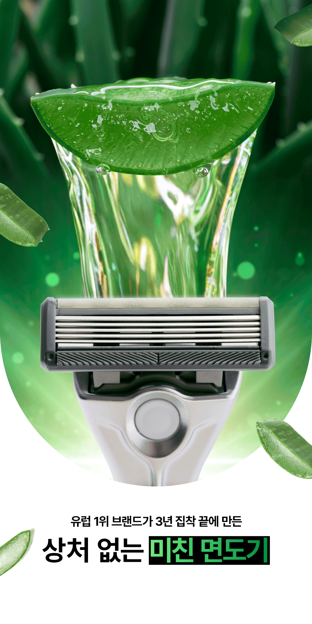 스킨케어 브랜드가 만들어 더욱 섬세한 - 강철 5중 면도날과 천연 대나무 손잡이, 알로에 스트림이 자극없이 밀착면도를 도와줍니다