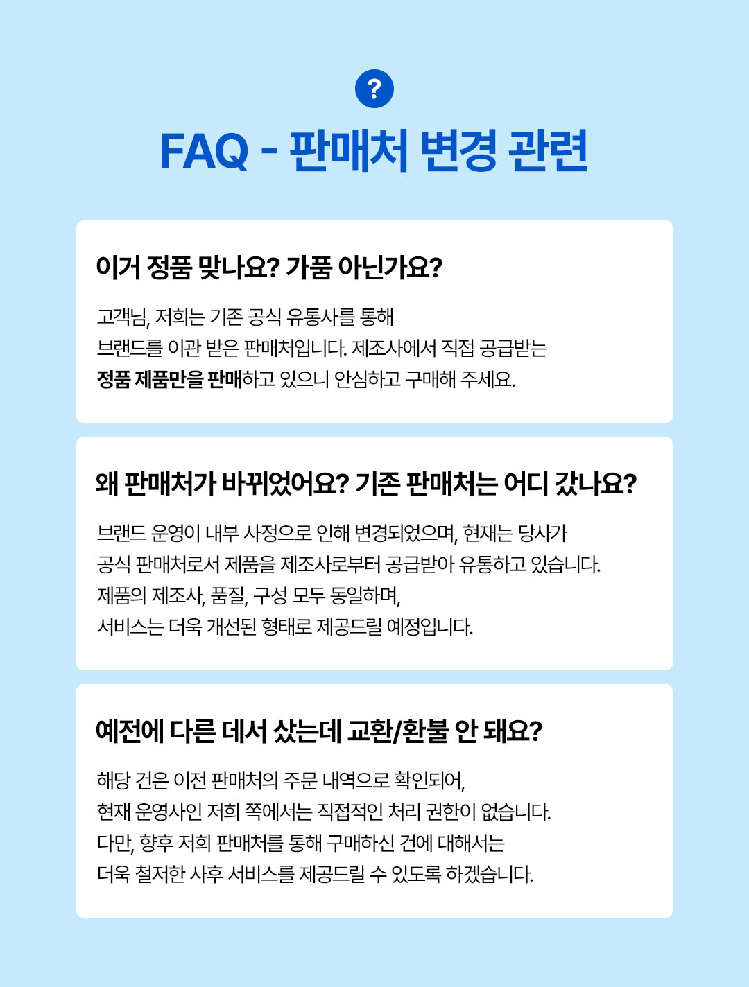 대량 구매하셨더라도, 수령/개봉 후 장기간 경과한 제품의 경우, 귀책 여부 확인이 어려워 처리가 불가하니, 꼭 안내된 기한 내에 문의 부탁드립니다.