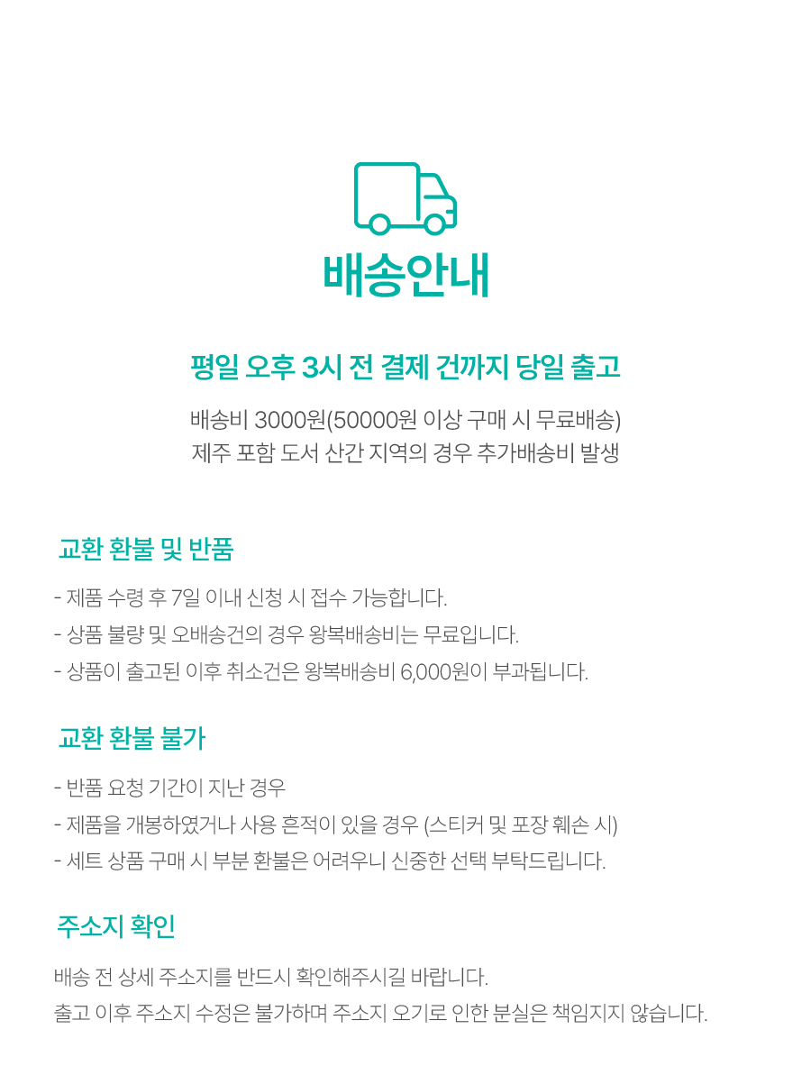 • 세트상품 부분반품/ 신선/ 냉장/ 냉동식품의 경우, 변심으로 인한 반품이 불가합니다.