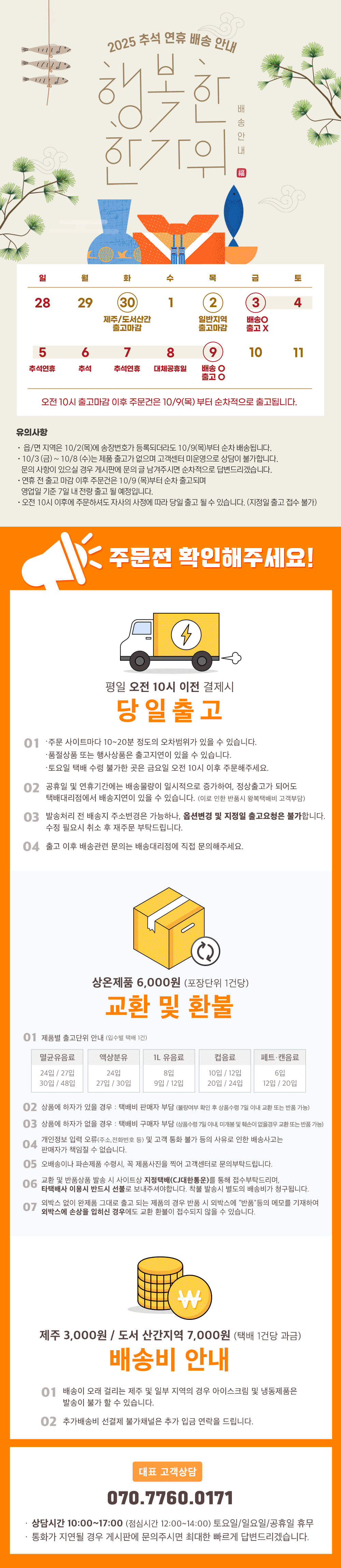 • 일부 특가 상품의 경우, 인수 후에는 제품 하자나 오배송의 경우를 제외한 고객님의 단순변심에 의한 교환, 반품이 불가능할 수 있사오니, 각 상품의 상품상세정보를 꼭 참조하십시오.