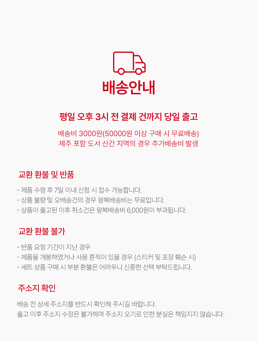 • 상품 단상자에 부착된 개봉스티커 훼손 등 판매가치가 훼손된 상품의 경우 반품 불가합니다.