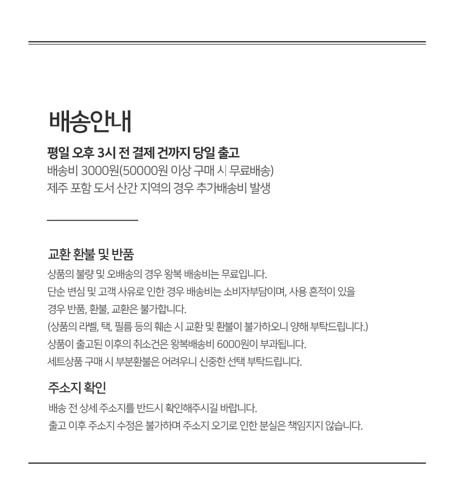 반품시, 반품배송비 (부분 3000원, 전체 6000원)가 부과됩니다.